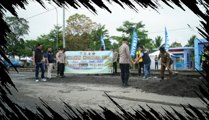 Sebanyak 65 personel gabungan dari Polres OKI, Kodim 0402/OI-OKI, Satpol PP, Dinas PUPR, dan Senkom bekerja sama untuk menambal jalan yang berlubang menggunakan campuran batu koral, pasir, dan semen.